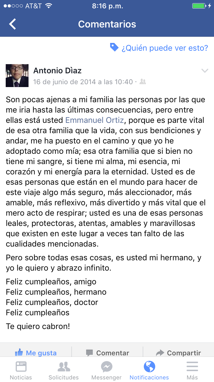 4 años han pasado, todavía me duele, lo extraño, lo quiero y eso se lo hice saber cuando estuvo con nosotros. por lo tanto esto lo escribo esto para los que quedamos en este plano de existencia. En términos de ser la persona social que era antes pues no lo he sido, porque decidí trabajar en mi, en mi dolor, en todo el caos en el que mi vida se fue, honestamente hoy me siento mejor pero como dicen en AA esto es de una día a la vez. Que yo halla tomado esta decisión no quiere decir que haya dejado de querer a mis amigos o familia, simplemente hago lo puedo, lo mejor que puedo, eso sumado a que soy un workaholic (ya no soy emprendedor pero sigo siendo ñoño), eso explica que hoy sea como un fantasma. Me volví malo a) en mantenerme en contacto, b) ponerme al corriente, c) hacer planes pero sepan que pienso en ustedes, les deseo todo el bienestar y felicidad.